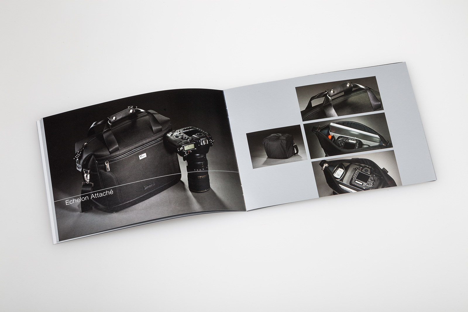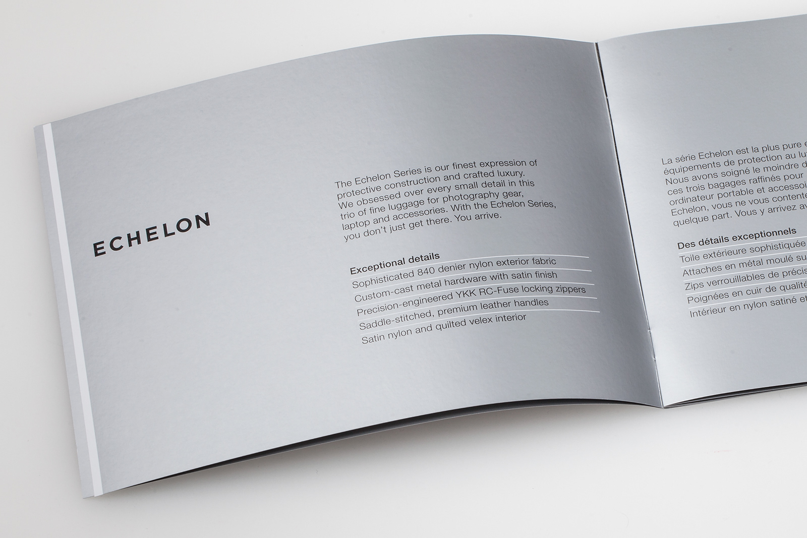 Logo design, concept and layout of sales brochure introducing Lowepro's Echelon Series high-end protective gear for professional camera equipment.